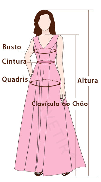 Ao escolher o tamanho customizado, busto, cintura, quadris, clavícula ao chão (para vestidos longos), clavícula à bainha (para vestidos curtos) em CM. Como medir: https://www.lavetir.com.br/pages/como-medir
